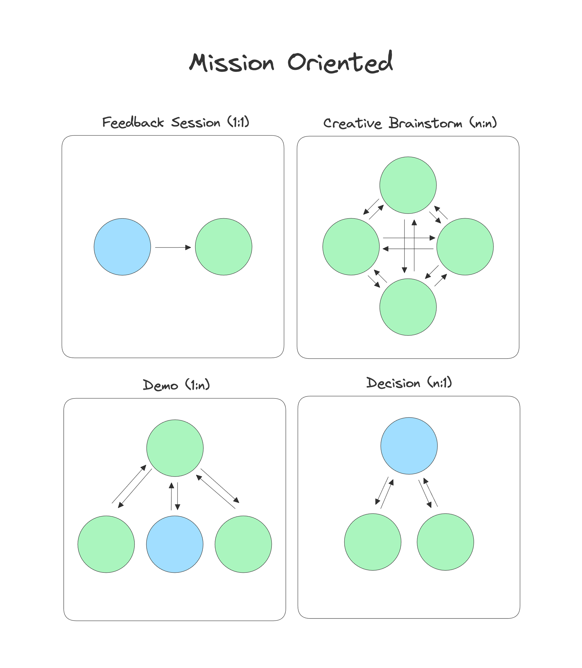 - Creative Brainstorm (n:n): Creative brainstorming sessions involve a group of people, often peers, coming together to generate ideas and solutions. They are mission-oriented as they seek to produce a tangible outcome in the form of ideas or prioritization decisions. Whoever calls the meeting is responsible for communicating the outcome or any decisions to the rest of the organization.