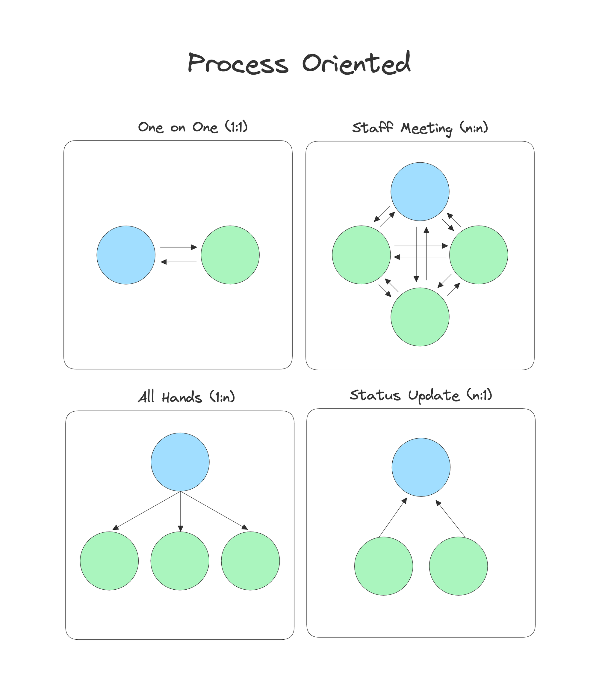 - All Hands (1:n): An All Hands meeting involves the entire organization or large teams, where leadership addresses all employees to share important company updates, strategic direction, and engage with the workforce at large. Typical cadence: monthly or quarterly