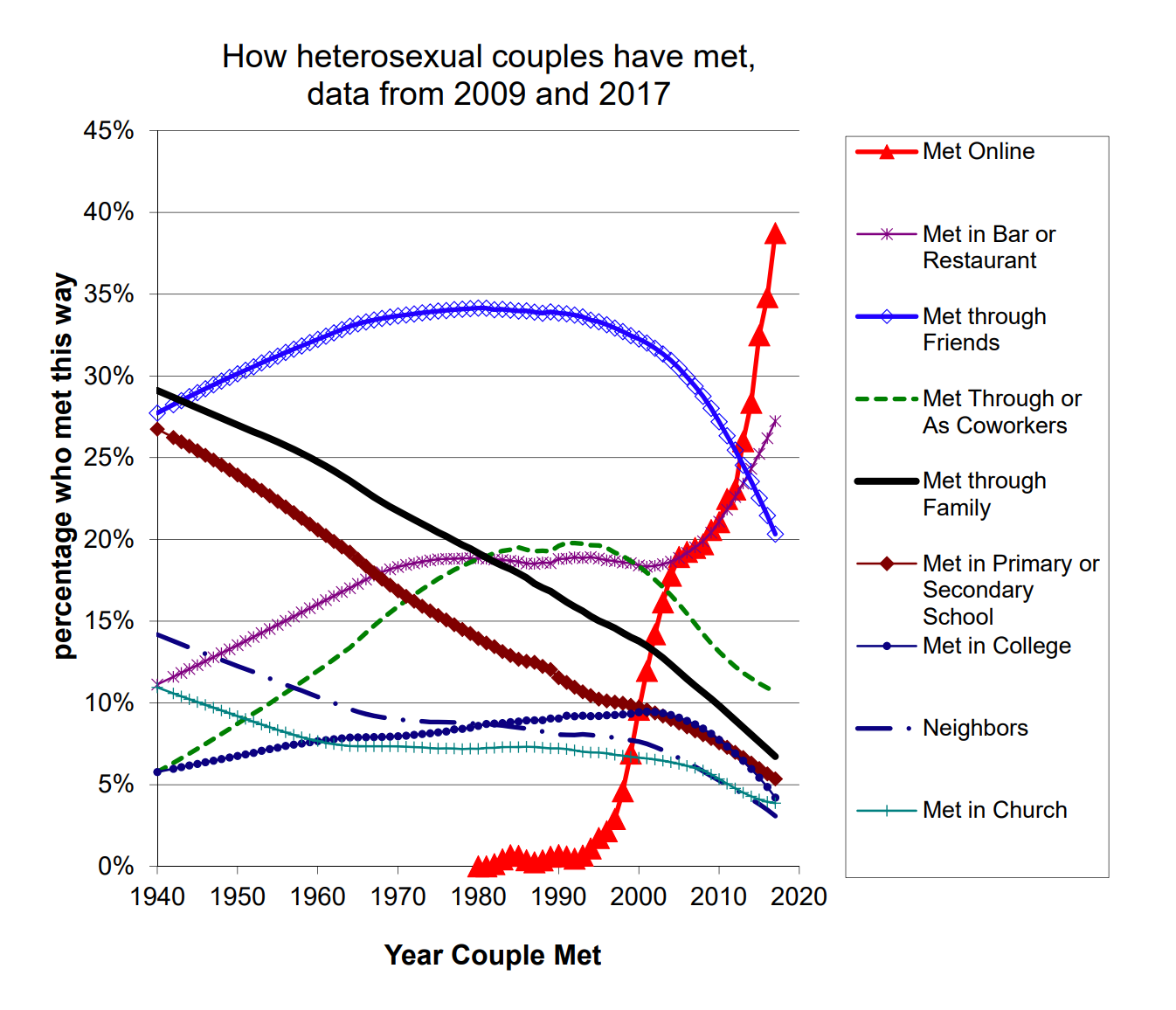 The most traditional ways of meeting for heterosexual couples, i.e. meeting through family, meeting through church, meeting in the neighborhood, and meeting in primary or secondary school, have all been declining sharply since 1940.