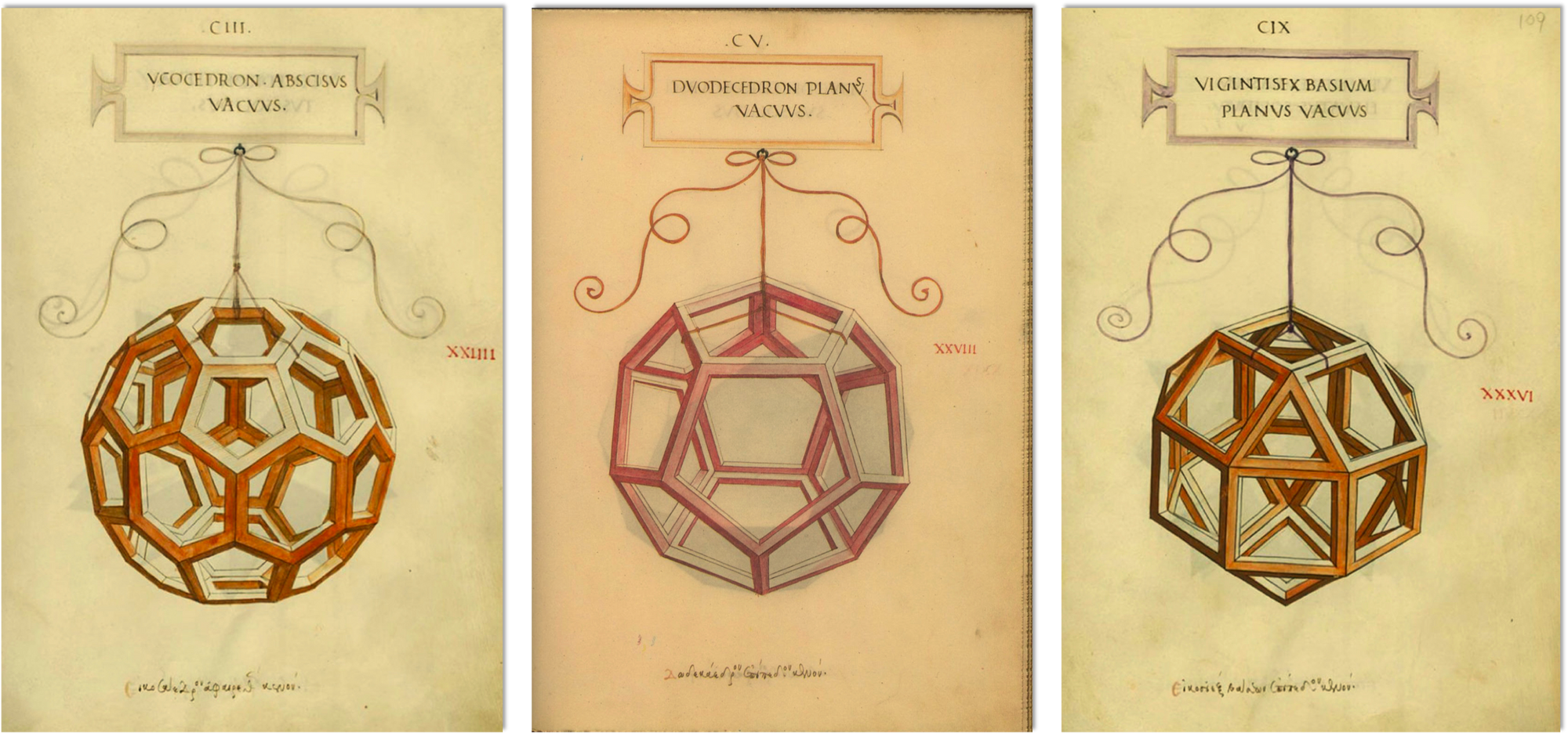 In return for the geometry lessons, Leonardo illustrated a beautiful series of covers for Luca’s first major work, a textbook for use in the schools of Northern Italy. For several years, Leonardo and Pacioli lived together, blending art and mathematics to create the beautiful images below.