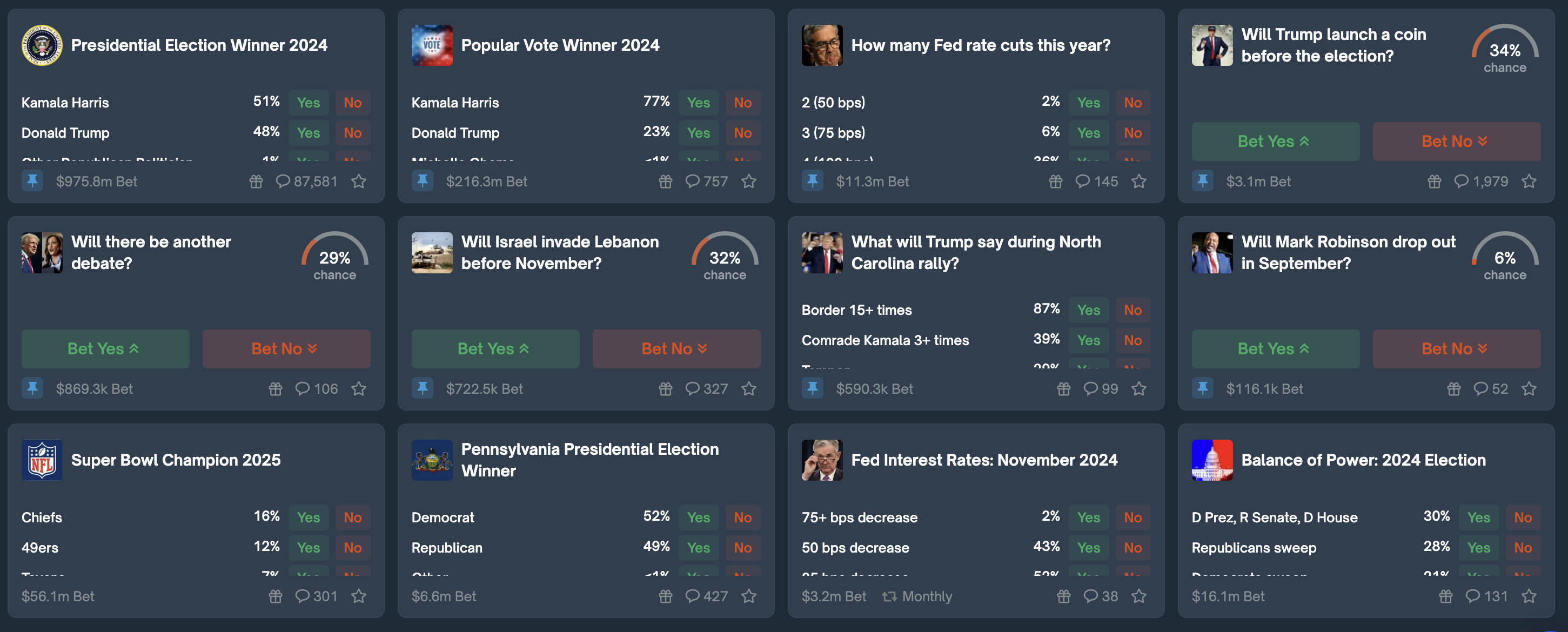 Political outcomes are the main attraction for prediction markets (the 2024 U.S. presidential market has almost $1B in trading volume), but other markets are beginning to emerge for finance, global conflicts, and memes.