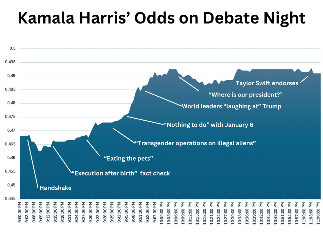 Prediction markets allow anyone to bet on the outcome of an event. Since there is real money at stake, these markets update in real-time to incorporate breaking news and current events. For example, here are Kamala Harris' odds of winning the upcoming election on a per-minute basis during her recent debate with the former President.