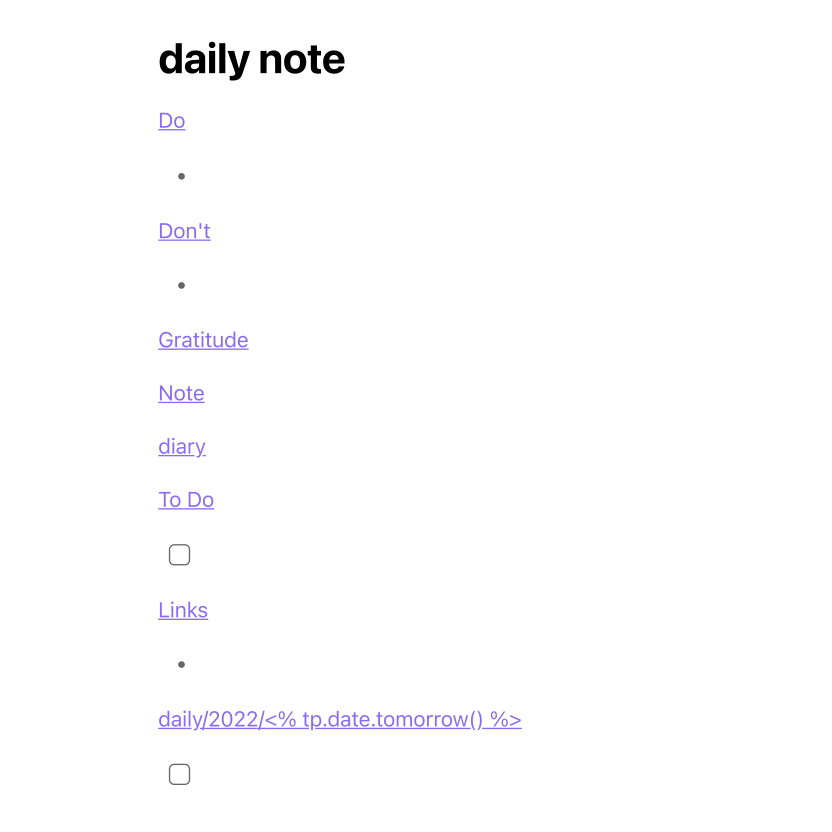 Daily notes are where I do 90% of my writing in Obsidian. I use a template that has several categories and automatically generates a new note for each day.