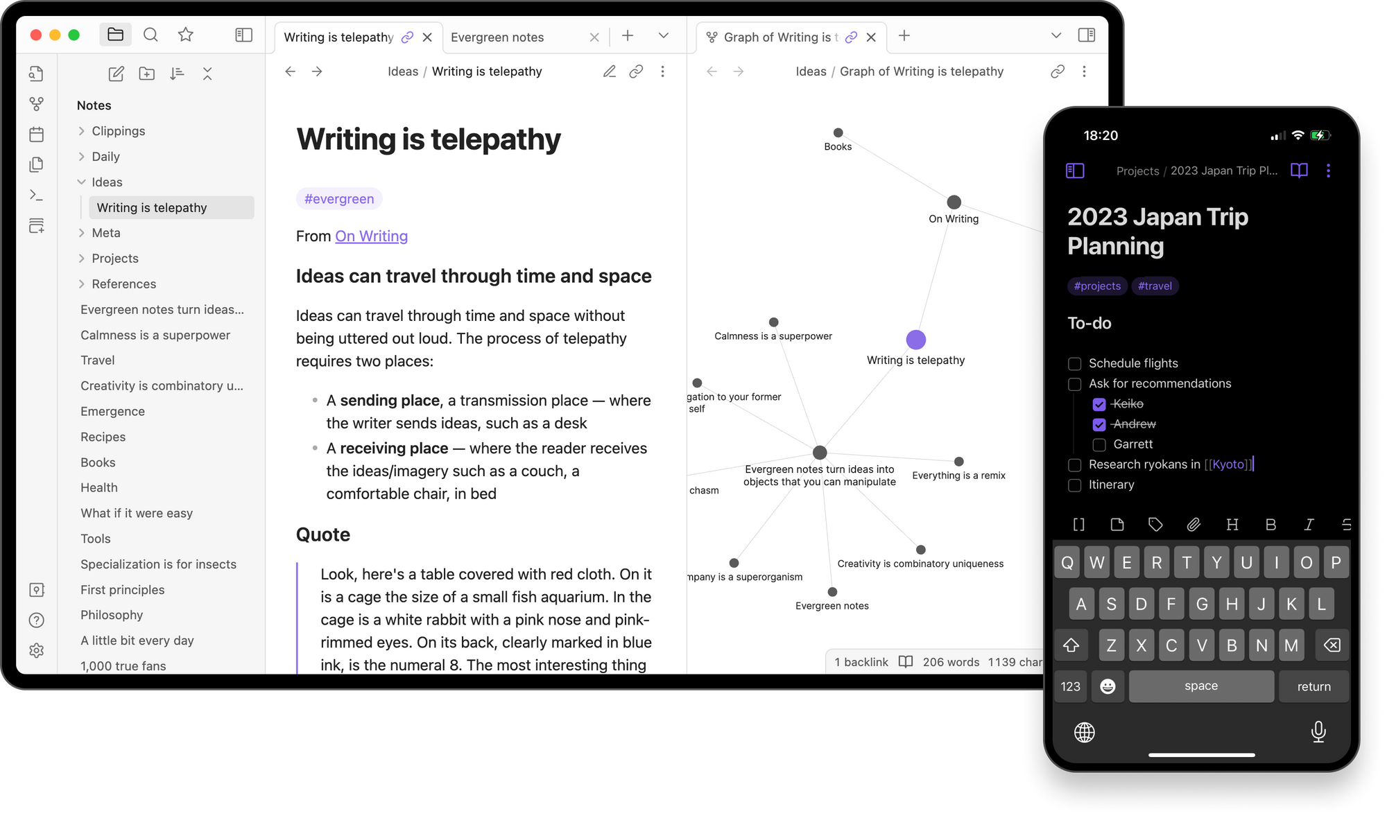 I use Obsidian to take notes. Obsidian is a mobile and desktop app that allows you to write notes as local Markdown files. It supports backlinks and the ability to view your entire note history as a graph.