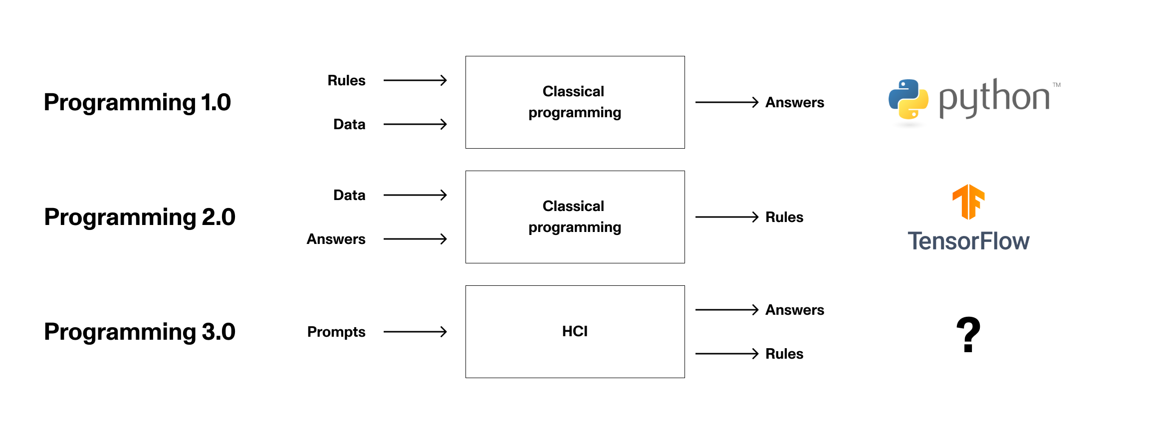 After using GPT, I’m increasingly convinced that we’re seeing the birth of programming 3.0. Before I explain why, it’s important to note that new paradigms in technology are often built on the implicit assumption that the previous layer in the stack exists. We’ve been in the “machine learning” era since ~2014, and while there is still plenty of business opportunity for both programming 1.0 and 2.0, this new model of human-computer interactions feels totally different.